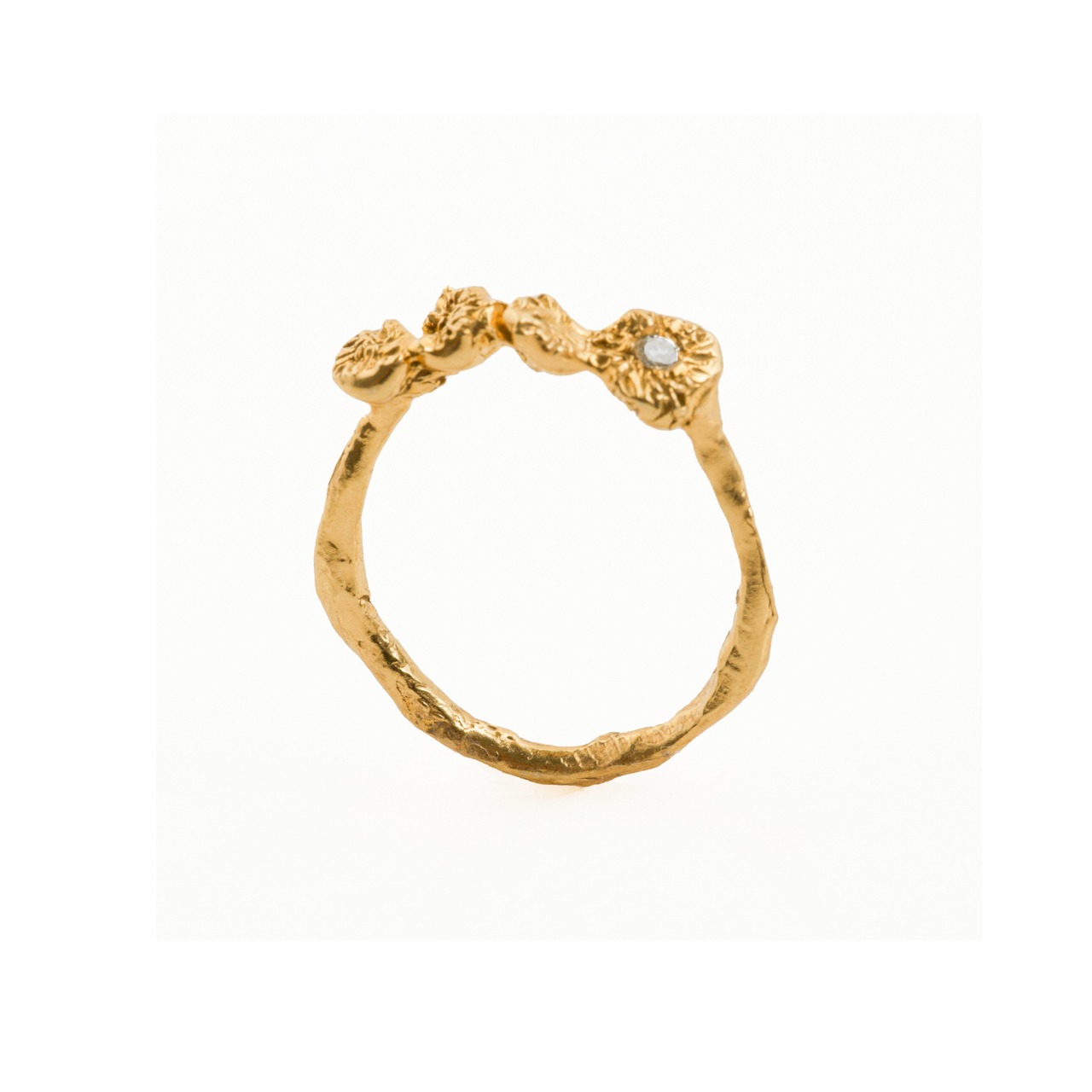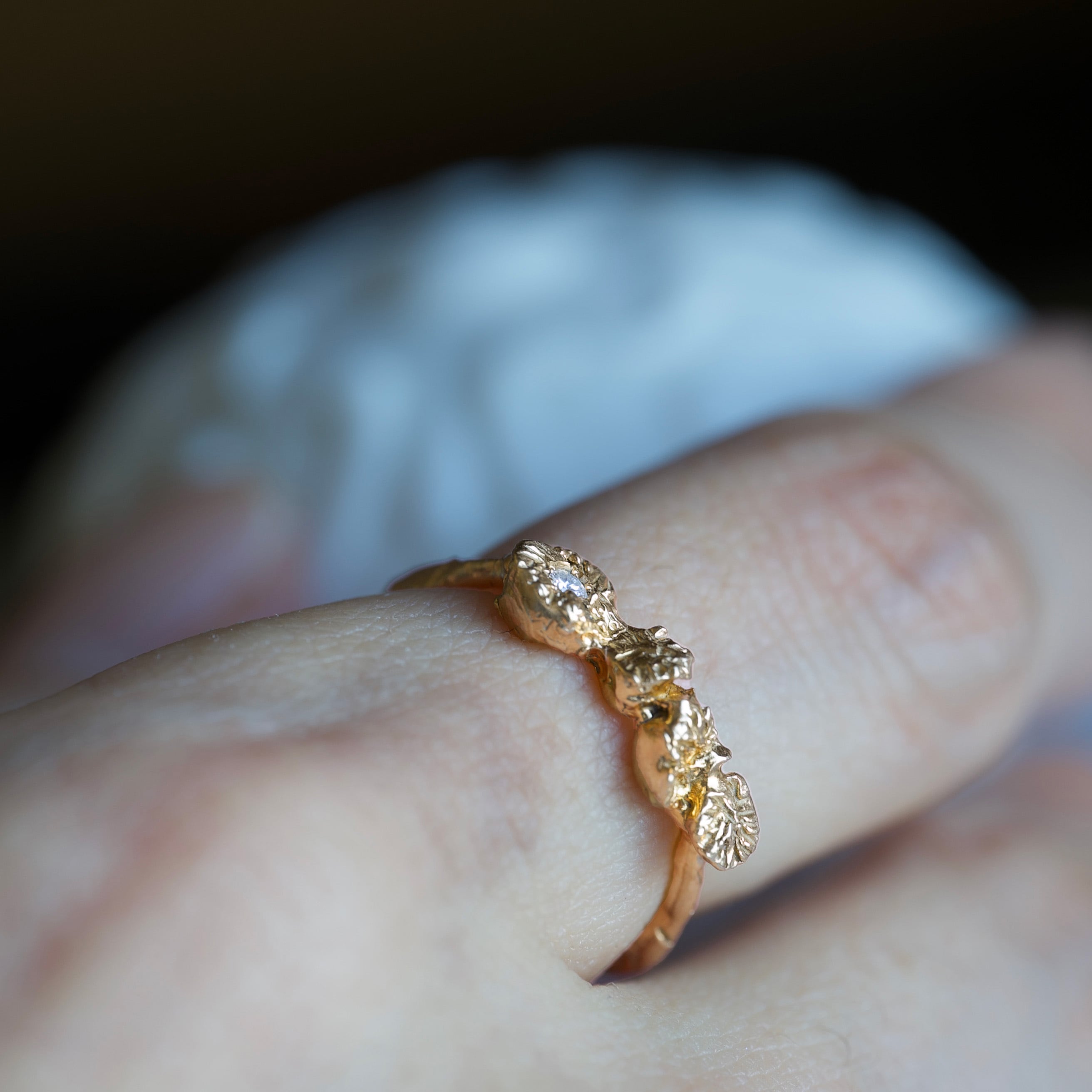 4つの花とダイヤモンドのリング、一つ一つの花のフォルムの違い、アームのフォルムの有機的な存在感…。身に着ける方のお守りとなるような生命感溢れるリングです。